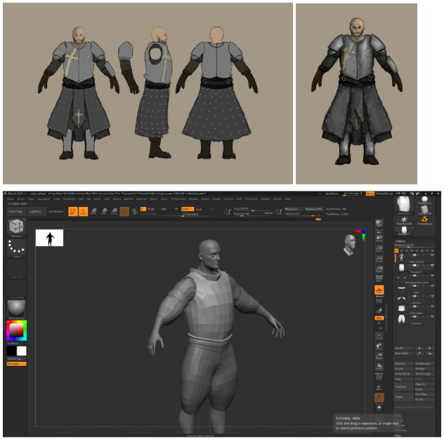 I am pleased with the progress I have made in this first week of production. Throughout pre-production I produced a series of concepts before finalising an orthographic for the Knight class. Since then I have begun low-poly modelling the base mesh and basic clothing forms in ZBrush. I am optimistic that these basic shapes will allow me to produce some appealing high poly clothing forms, armour pieces and a realistic head sculpt that will be consistent with the game assets.