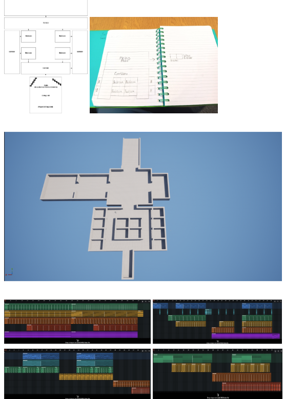 Jack - 6/10/2025 - 17/10/2025 [I drew a few layout sketches of the level 2 map on both Draw.io as well as in my notepad. I received feedback from my fellow team-mates who said it was too short, and so I’ve decided to re-do the layout to make it more sizeable and explorable but not too open-ended, and I’ve also decided to start the level off in the entrance to the hallway of bedrooms rather than the entrance to the dining hall. I started creating a blockout of the layout within Unreal Engine 5, which I am currently expanding alongside the new level layout sketch I am working on. I also composed a few original music tracks via BandLab to use in-game, with music for all of the game’s three levels plus the title screen and the boss arena. I aimed for the game’s official soundtrack to be a mix of dark ambient and classical genres to match both the tone, setting, and atmosphere of our game.